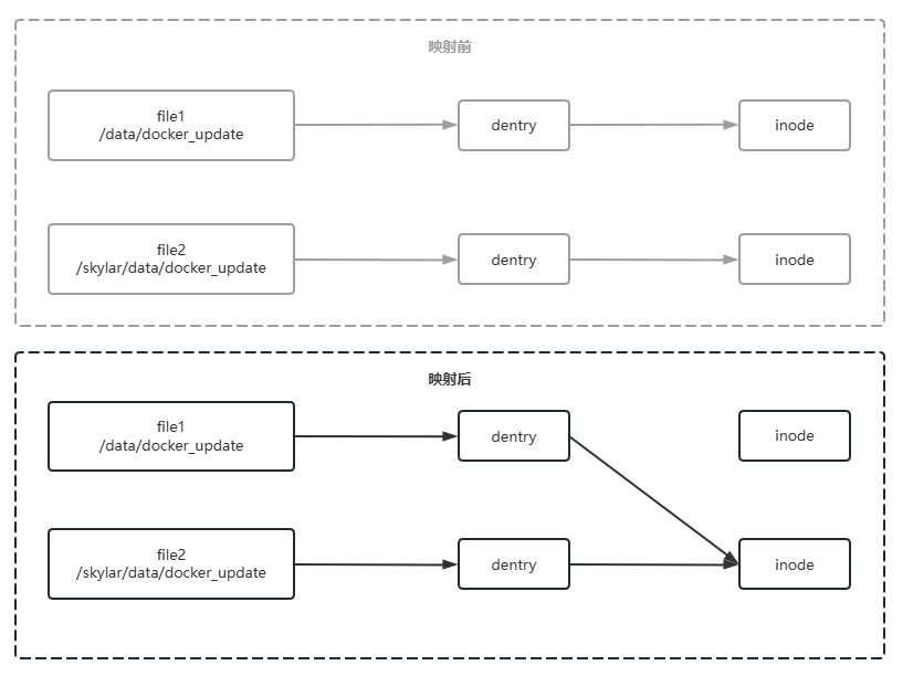 其实现的本质原理其实很简单,就是挂载后修改了原docker容器内路径的dentry对应的inode指向,改成了宿主机对应路径对应的inode,从而后续的文件读写都是在操作宿主机的目录,至于dentry和inode这里不再详述。