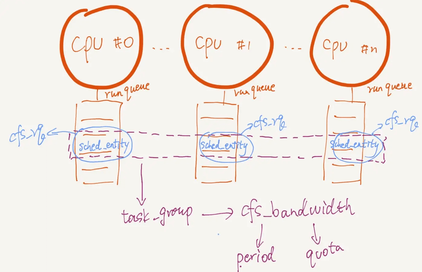 基于以上原因,Google 提出了 CFS CPU 带宽控制(CFS bandwidth control)方案,并合并到了主线内核。 这里的“CPU 带宽”指的就是 CPU 份额,或者说的更清楚点,CPU 比例。 SCHED_RT 中其实已经有这个功能,这里指的是 SCHED_NORMAL 支持这个功能。