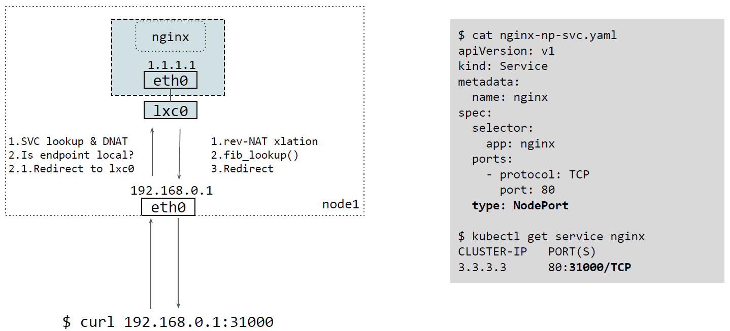 具体来说,在 TC ingress 插入一段 BPF 代码,然后依次执行:Service 查找、DNAT、 选择合适的 egress interface、SNAT、FIB lookup,最后发送给相应的 node,