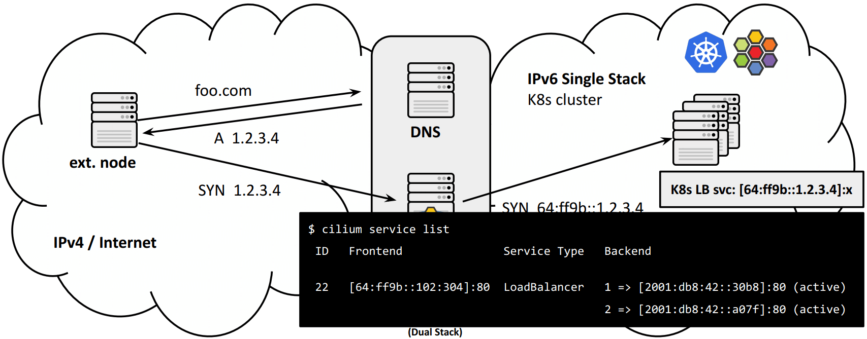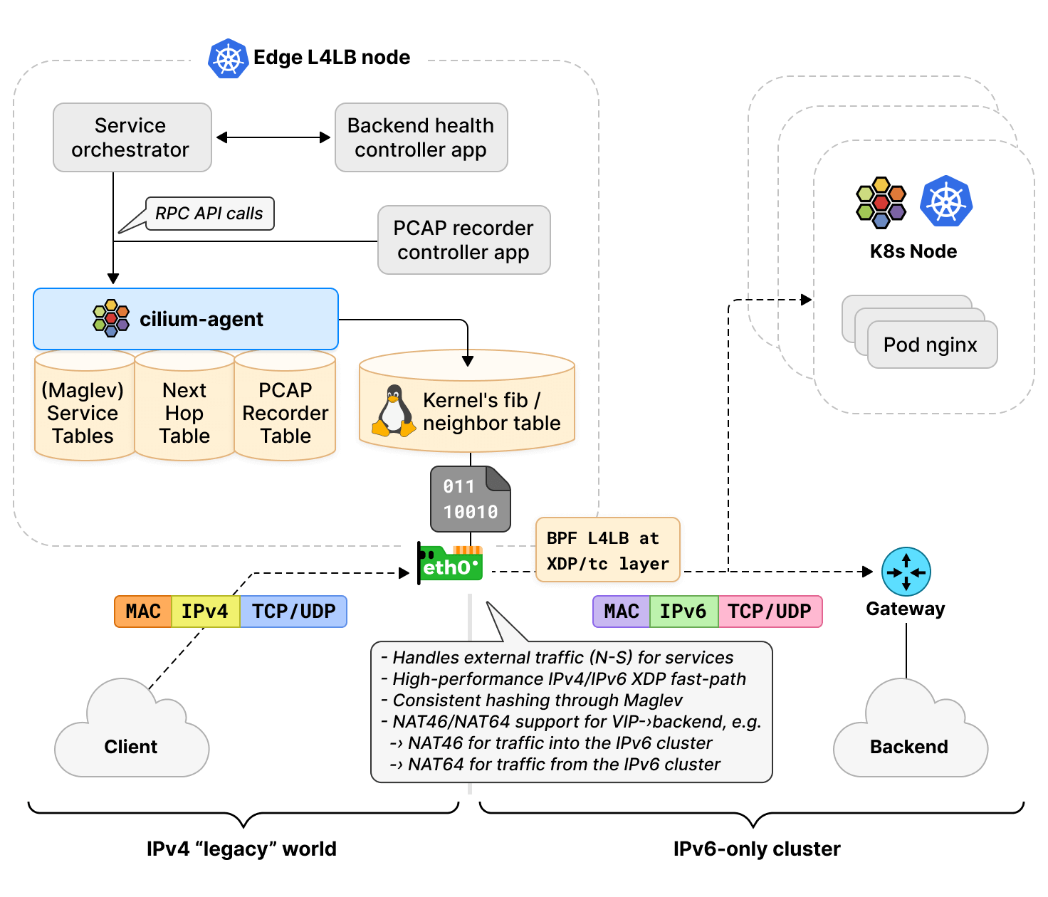 - 左上:承担 NAT46/64 功能的 Cilium L4LB 节点;