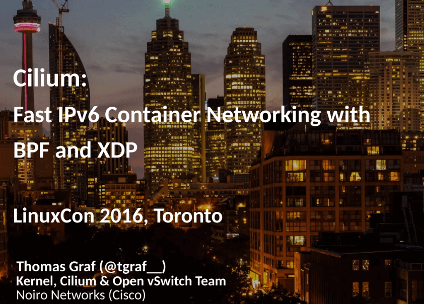 Cilium 是作为一个纯 IPv6 容器网络实验项目(”The Cilium Experiment”)启动的, 下面这张截图就是我们在 2016 年 LinuxCon 的分享, Cilium: Fast IPv6 Container Networking with BPF and XDP,