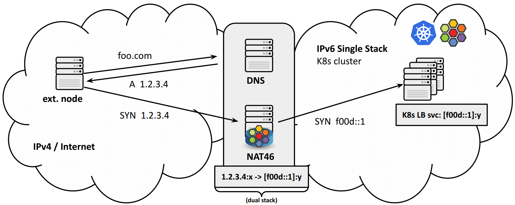 IPv6-only K8s 与传统 IPv4 服务的对接,使用的是 NAT46/NAT64,