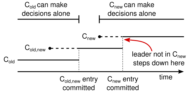 - Membership changes(节点变更): 使用一种新的联合共识 (joint consensus)方式,特点是新老配置所覆盖的两个大多数(majorities)子集 在变更期间是有重叠的,并且集群还能正常工作。