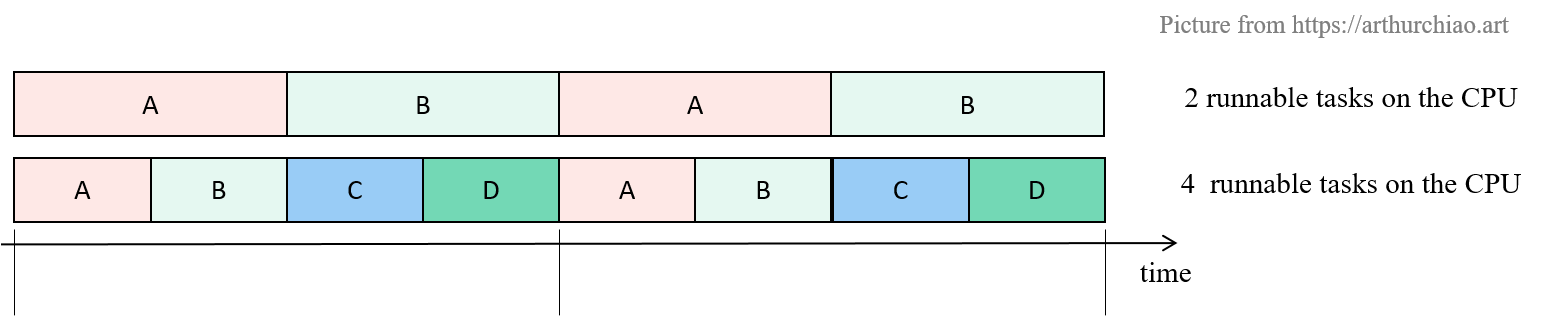CFS(Completely Fair Scheduler)是 Linux 内置(也是目前默认)的一个内核调度器, 如名字所示,它实现了所谓的“完全公平”调度算法,将 CPU 资源均匀地分配给各进程( 在内核代码中称为“任务”,task)。 简单来说,如果一台机器有一个 CPU 多个(计算密集型)进程,那采用 CFS 调度器时,
