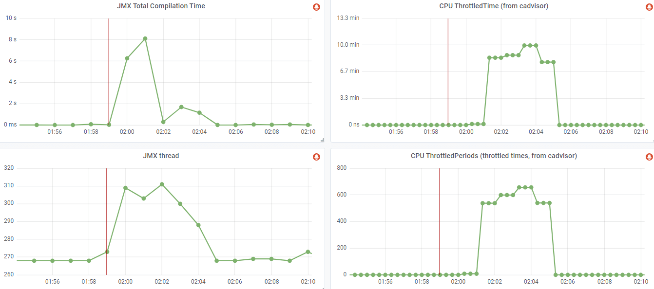 02:01开始,业务容器开始throtte(总 CPU 时间不变,平均到每个线程的时间片少了,调度周期内的等待时间更长)。