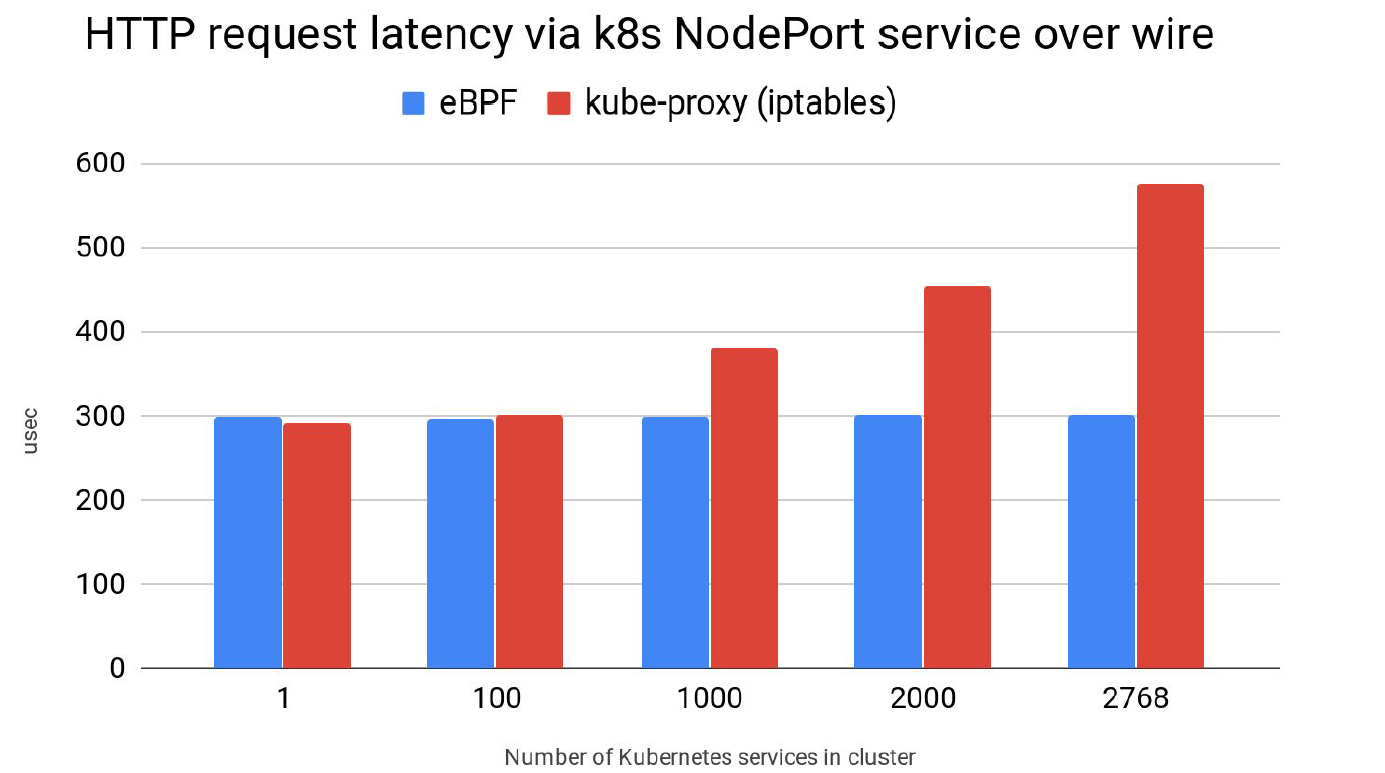 可以看到,随着 Service 数量从 1 增加到 2000+,kube-proxy/iptables 的请求延 迟增加了将近一倍,而 Cilium/eBPF 的延迟几乎没有任何增加。