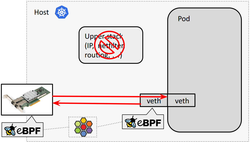 meta device,替代 veth pair 取得更极致的网络性能; - Cilium 的 eBPF 转发架构如何通过可编程的方式绕过(bypass)大部分无关的内核网络栈 (仍然基于内核网络栈,只是绕过无关部分,与 DPDK 等完全绕过内核的方式存在本质区别),显著提升网络性能。