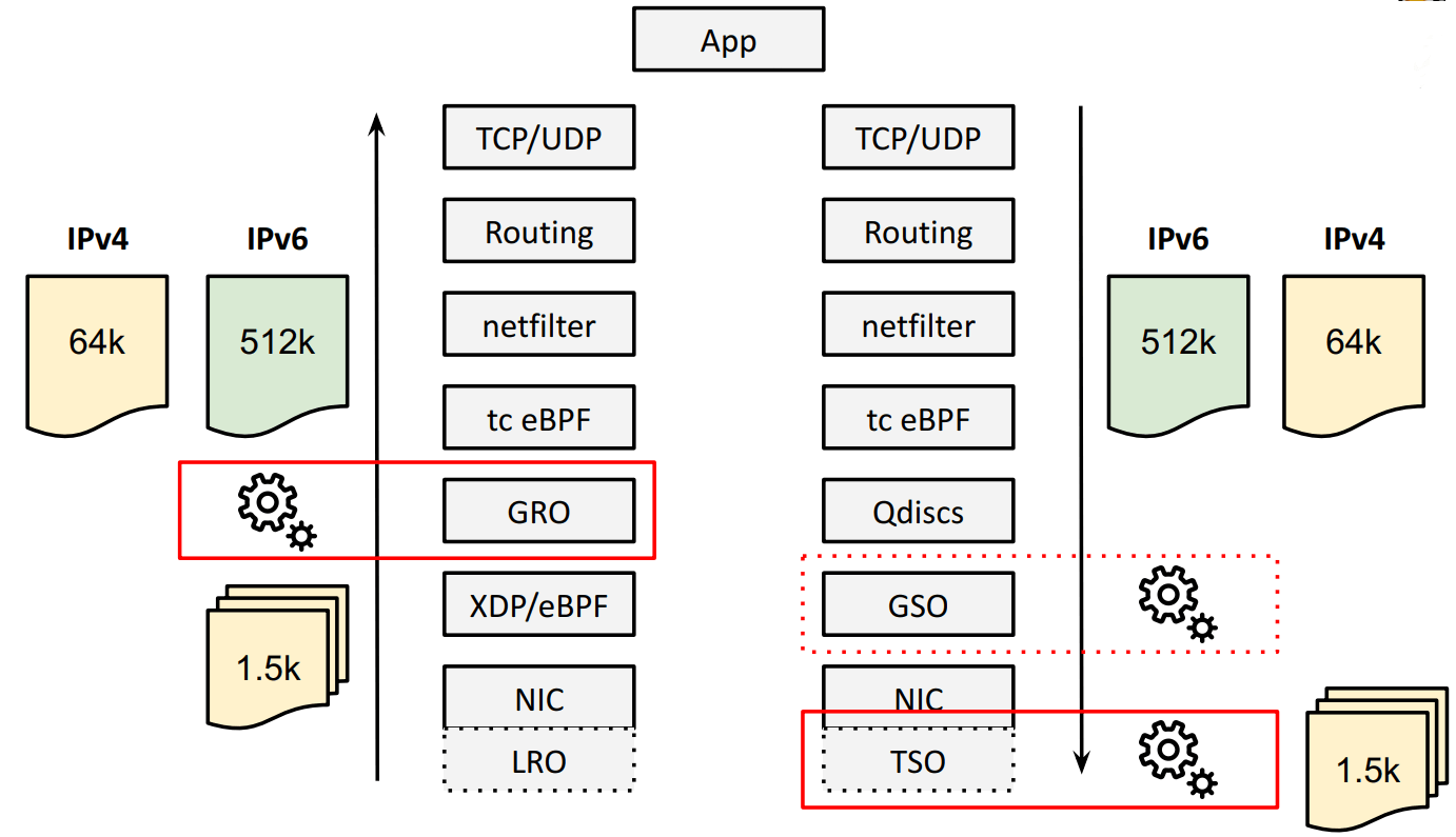 TX 方向的 TSO 也有一样的限制。也就是说,使用 IPv4,我们在 TX/RX 方向最大只能支持 64KB 的大包。