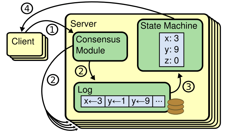 讨论 replicated state machines [37] 时,通常都会涉及到共识算法。在这种模型中, 若干节点上的状态机计算同一状态的相同副本(compute identical copies of the same state),即使其中一些节点挂掉了,系统整体仍然能继续工作。