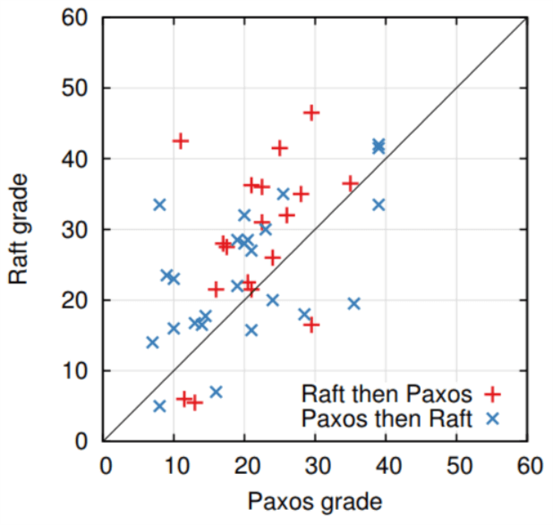 Fig 14. A scatter plot comparing 43 participants’ performance on the Raft and Paxos quizzes. Points above the diagonal (33) represent participants who scored higher for Raft.