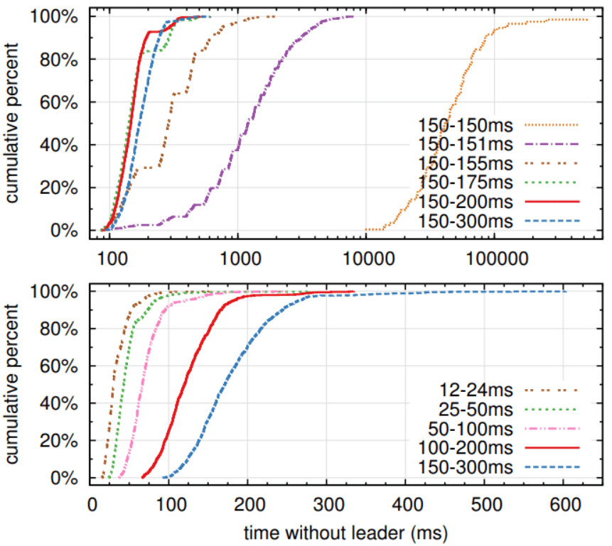 Fig 16. 检测与替换一个挂掉的 leader 所需的时间。 The top graph varies the amount of randomness in election timeouts, and the bottom graph scales the minimum election timeout. Each line represents 1000 trials (except for 100 trials for “150–150ms”) and corresponds to a particular choice of election timeouts; for example, “150–155ms” means that election timeouts were chosen randomly and uniformly between 150ms and 155ms. The measurements were taken on a cluster of five servers with a broadcast time of roughly 15ms. Results for a cluster of nine servers are similar.